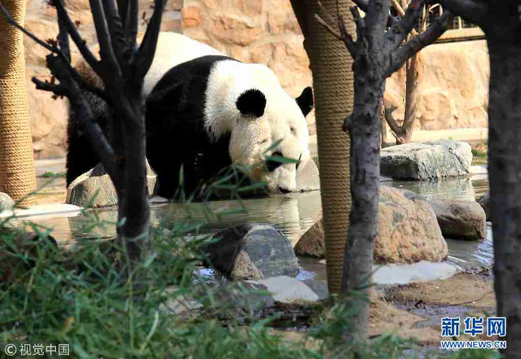 3月27日,山東濟南春暖花開,動物園內熊貓在園中散步吃美食享受春天美好陽光。(圖片來源:視覺中國)