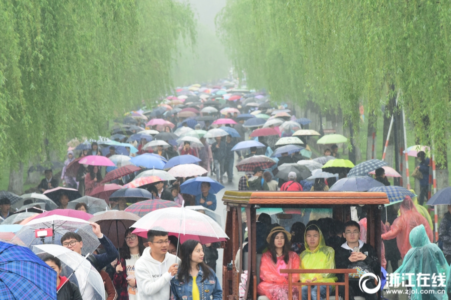 4月5日,清明小長假首日,杭州細雨綿綿,西湖景區游客絡繹不絕。杭城雖降雨降溫,但西湖景區前來賞花踏青的游客如潮,斷橋似人橋。(浙江在線拍友 里爾 柱子 攝)