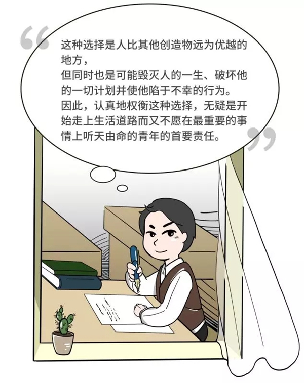 “這種選擇(ze)是人比其他創造物遠為(wei)優(you)越的(de)(de)(de)地方,但(dan)同(tong)時也是可能毀滅人的(de)(de)(de)一生、破壞他的(de)(de)(de)一切(qie)計劃并使他陷(xian)于不幸的(de)(de)(de)行為(wei)。因(yin)此,認真地權衡這種選擇(ze),無(wu)疑是開始(shi)走上生活道路(lu)而又不愿在(zai)最重要的(de)(de)(de)事情上聽天(tian)由命的(de)(de)(de)青年的(de)(de)(de)首(shou)要責任。”
