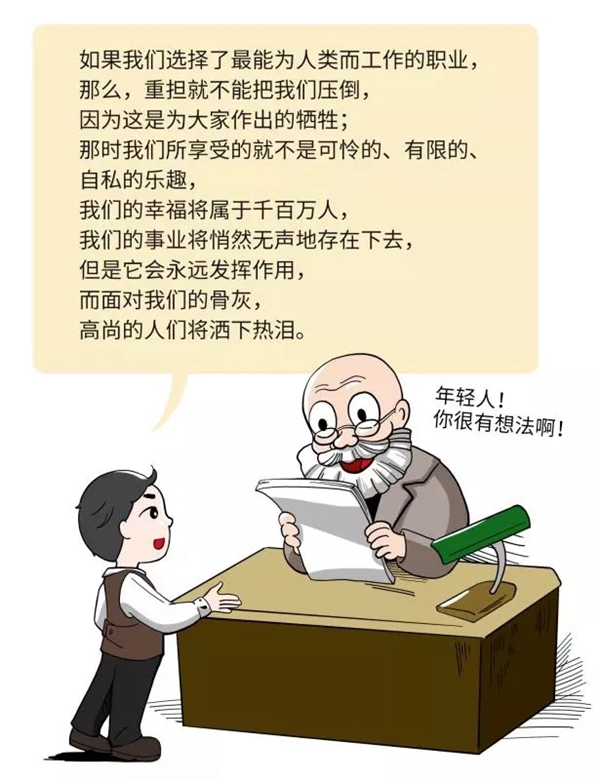 這是(shi)非(fei)常(chang)有名的(de)一段(duan)話,從這段(duan)話中(zhong),我們可(ke)以很明顯看(kan)出,馬(ma)克(ke)思(si)這里(li)的(de)討論(lun)已經遠(yuan)遠(yuan)地超出了(le)世俗的(de)職業(ye)范圍,他(ta)實際上講的(de)是(shi)理想信念(nian)和人生志向。