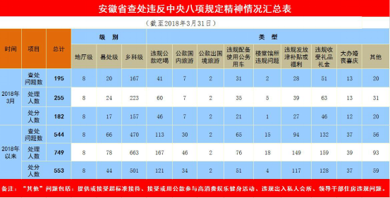 今年1至(zhi)3月,安徽省共查處(chu)違反中央八項規定精(jing)神問題544個,處(chu)理749人,給(gei)予黨紀政務處(chu)分553人。