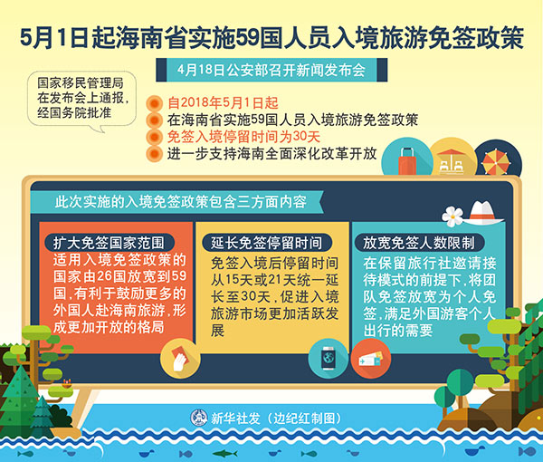 公安部18日召開新聞發布會,國家移民管理局在發布會上通報,經國務院批準,自2018年5月1日起,在海南省實施59國人員入境旅游免簽政策,免簽入境停留時間為30天,進一步支持海南全面深化改革開放。>>