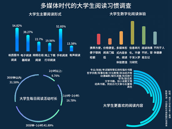 調(diao)查結果顯示(shi),54.82%受(shou)訪大學(xue)(xue)生(sheng)閱(yue)(yue)讀(du)(du)仍以(yi)紙質圖書(shu)(shu)為主,38.27%的(de)受(shou)訪者選擇使用電子閱(yue)(yue)讀(du)(du)器,52.85%的(de)受(shou)訪大學(xue)(xue)生(sheng)選擇使用手機進行閱(yue)(yue)讀(du)(du)。值得一提(ti)的(de)是,13.38%受(shou)訪大學(xue)(xue)生(sheng)偏愛有聲閱(yue)(yue)讀(du)(du),具體(ti)方式包括收聽錄(lu)音(yin)帶(dai)講書(shu)(shu)、微(wei)信(xin)語(yu)音(yin)推送、使用語(yu)音(yin)讀(du)(du)書(shu)(shu)機或有聲類App。