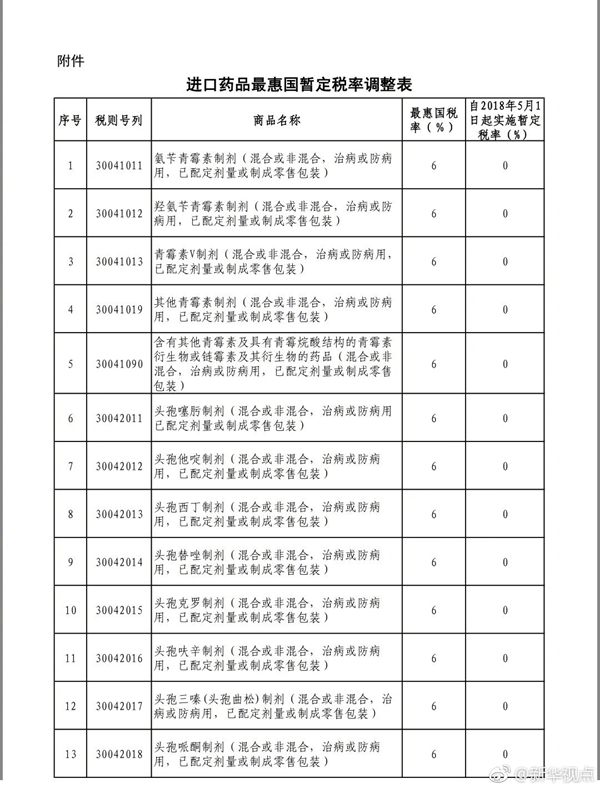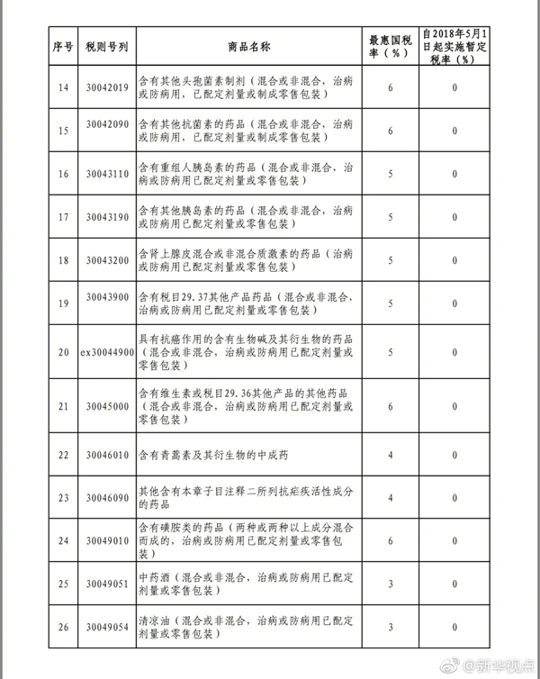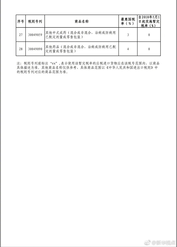 新華網北京4月23日電 財政部關稅司23日發布消息,5月1日起我國將取消包括抗癌藥在內的28項藥品進口關稅。調整后,除安宮牛黃丸等我國特產藥品、部分生物堿類藥品等少數品種外,絕大多數進口藥品,特別是有實際進口的抗癌藥均將實現零關稅。(記者郁瓊源) ????(據新華社“新華視點”微博報道)?