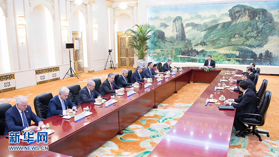 4月23日,國家主席習近平在北京人民大會堂集體會見來華出席上海合作組織成員國外長理事會會議的俄羅斯外長拉夫羅夫、印度外長斯瓦拉杰、哈薩克斯坦外長阿布德拉赫曼諾夫、吉爾吉斯斯坦外長阿布德爾達耶夫、巴基斯坦外長阿西夫、塔吉克斯坦外長阿斯洛夫、烏茲別克斯坦外長卡米洛夫、上海合作組織秘書長阿利莫夫、上海合作組織地區反恐怖機構執委會主任瑟索耶夫。新華社記者 李濤 攝