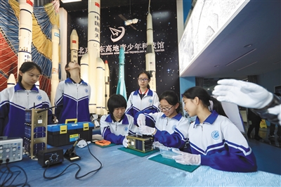 昨日,北京市東高地青少年科技館,學生在練習拆裝1:1衛星模型。新京報記者 王嘉寧 攝