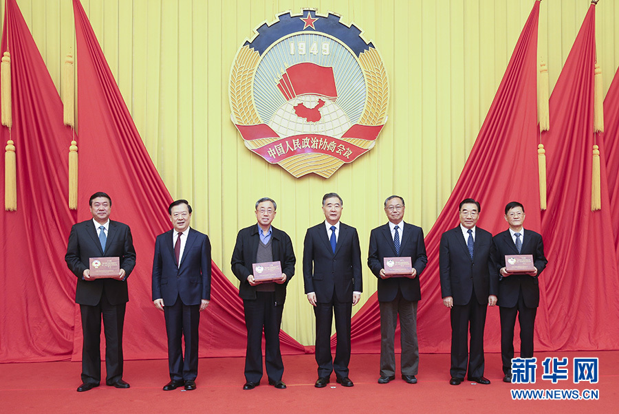 4月24日,全國政協在北京隆重舉行儀式,向不再連任的在京十二屆全國政協常委頒發紀念證牌。全國政協主席汪洋出席儀式并講話。這是汪洋等向部分不再連任的常委頒發紀念證牌。新華社記者 姚大偉 攝