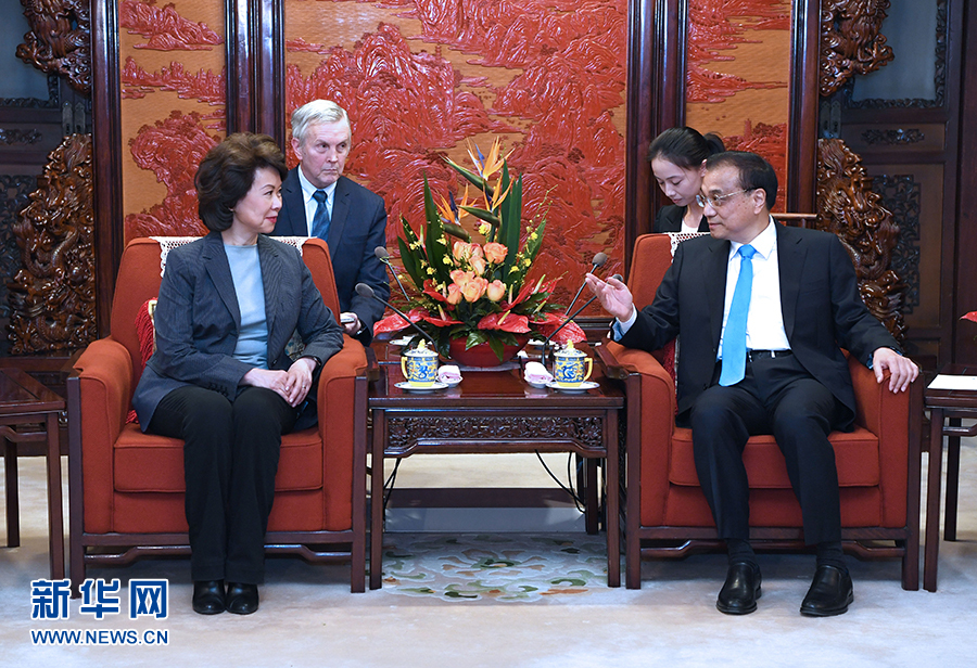 4月26日,國務院總理李克強在北京中南海紫光閣會見來華訪問并出席中美交通論壇第九次會議的美國運輸部長趙小蘭。 新華社記者 饒愛民攝