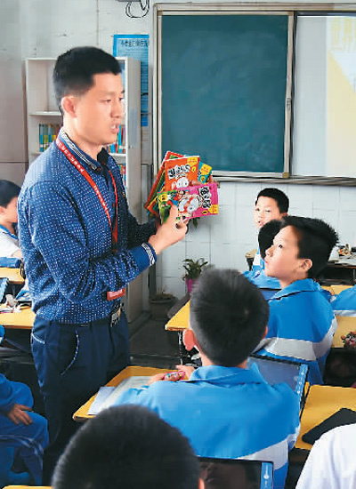 4月23日,江西省新余市分宜縣的執法人員在分宜縣第一小學向學生講解盜版書籍的鑒別方法。周亮攝(人民視覺)