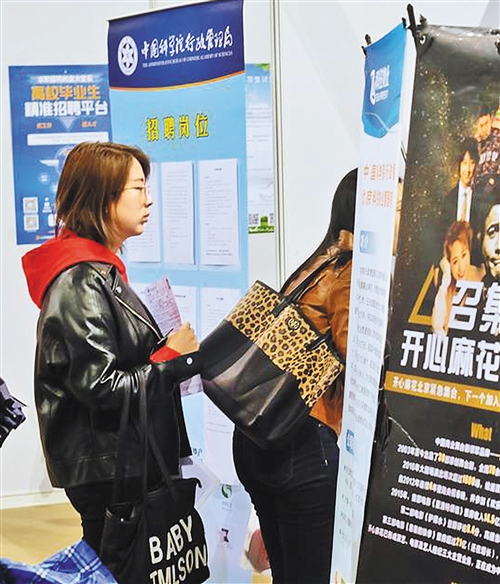 在招聘會現場,身著正裝的周源走走轉轉,仔細閱讀著用人單位的招聘海報。作為一名中文系碩士應屆畢業生,周源手里已經有了好幾份錄取通知書,她仍然顯得有點焦慮。還有2個多月就要畢業了,是回老家沈陽還是留在北京,她坦言還沒有想好。回到老家離父母更近一些,在大城市里發展機會更多,究竟如何取舍,她遲遲做不出決定。