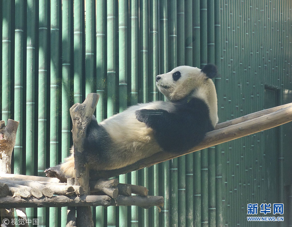 5月2日,在動物園內,熊貓曬著太陽,時不時伸個懶腰,翻個身,笨拙的動作盡顯萌態。(圖片來源:視覺中國)