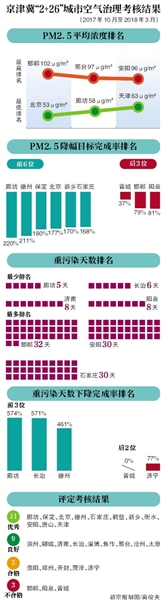評估結果顯(xian)示,2017年10月至2018年3月,“2+26”城(cheng)市PM2.5平均濃度最(zui)(zui)低的(de)3個城(cheng)市依次是北京、廊(lang)坊和(he)天(tian)津;濃度最(zui)(zui)高的(de)3個城(cheng)市依次是邯鄲、邢臺(tai)和(he)安(an)陽(yang)。