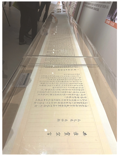 展廳中(zhong),一(yi)(yi)幅由5位(wei)江(jiang)蘇書(shu)法(fa)(fa)家集體(ti)創作(zuo)的22米(mi)長(chang)的《共產黨(dang)宣言(yan)》書(shu)法(fa)(fa)長(chang)卷(juan),展示著《共產黨(dang)宣言(yan)》震撼(han)人(ren)心(xin)的力量,同(tong)樣吸(xi)引了不少(shao)觀眾(zhong)的目光。這(zhe)幅小楷長(chang)卷(juan)有近一(yi)(yi)萬五千(qian)個漢字,由江(jiang)蘇書(shu)法(fa)(fa)家孫曉云(yun)、王衛軍、謝(xie)少(shao)承、張守(shou)躍、黃(huang)繼革聯(lian)合創作(zuo),在(zai)氣勢恢宏中(zhong)傳遞著中(zhong)華傳統書(shu)法(fa)(fa)的優美。據悉,這(zhe)也是國內首次以中(zhong)國傳統書(shu)法(fa)(fa)藝術形式詮釋馬克思主(zhu)義經典著作(zuo)。