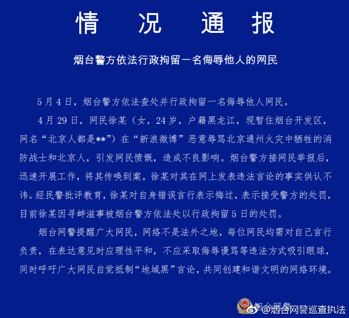 山東省(sheng)煙(yan)臺市公安(an)局網絡(luo)安(an)全保衛支(zhi)隊(dui)官方微博今(jin)日(ri)發布情(qing)況(kuang)通(tong)報。通(tong)報稱,一女子在微博惡意辱罵北(bei)京通(tong)州火災(zai)中犧牲(sheng)的消防戰士和北(bei)京人,造成不良影(ying)響,因尋釁滋事被煙(yan)臺警方依法處以行政(zheng)拘留5日(ri)的處罰。
