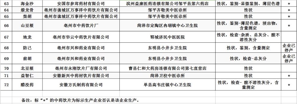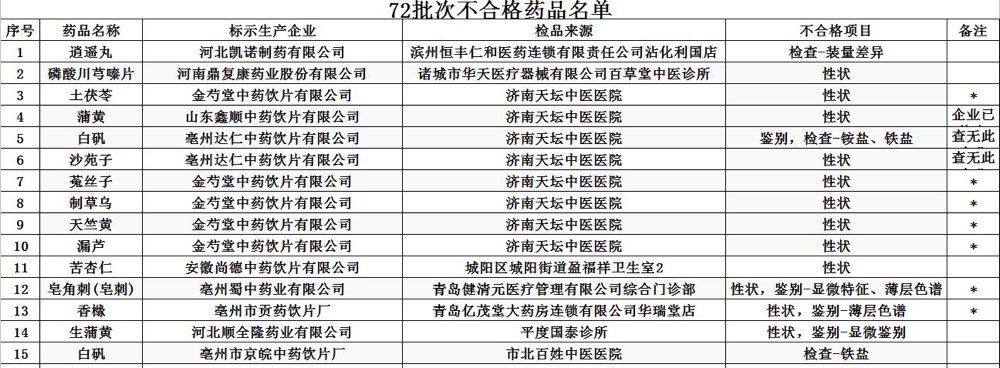 山(shan)東(dong)省食藥監局今(jin)天發布(bu)第5期藥品(pin)、中藥飲片抽檢結果(guo),72批(pi)次藥品(pin)質量抽檢不合格。