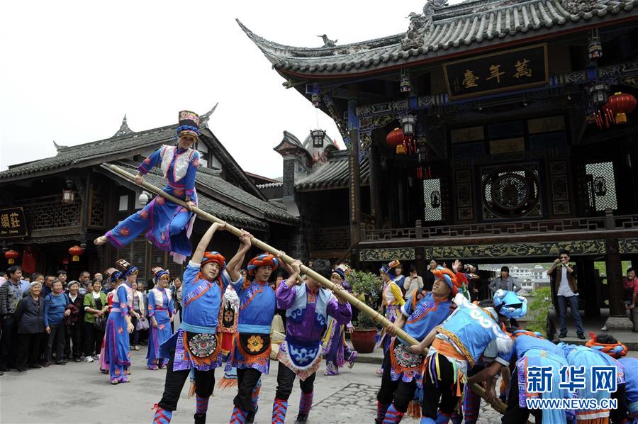 演員在汶川縣水磨鎮萬年臺進行民俗表演(2012年5月23日攝)。新華社發(王飛 攝)