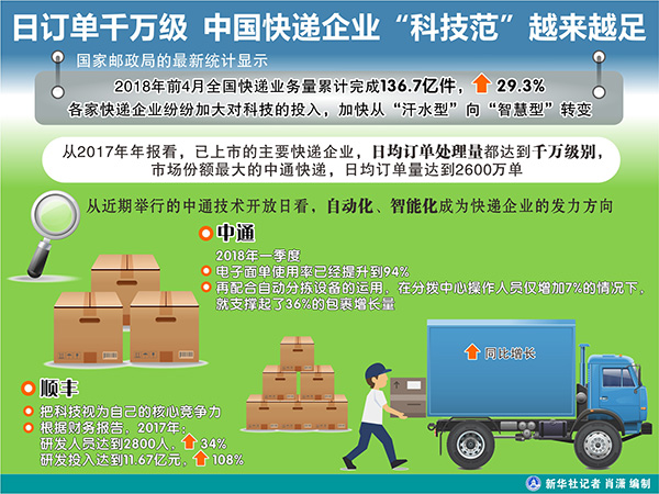 圖表:日訂單千萬級 中國快遞企業“科技范”越來越足 新華社記者 肖瀟 編制