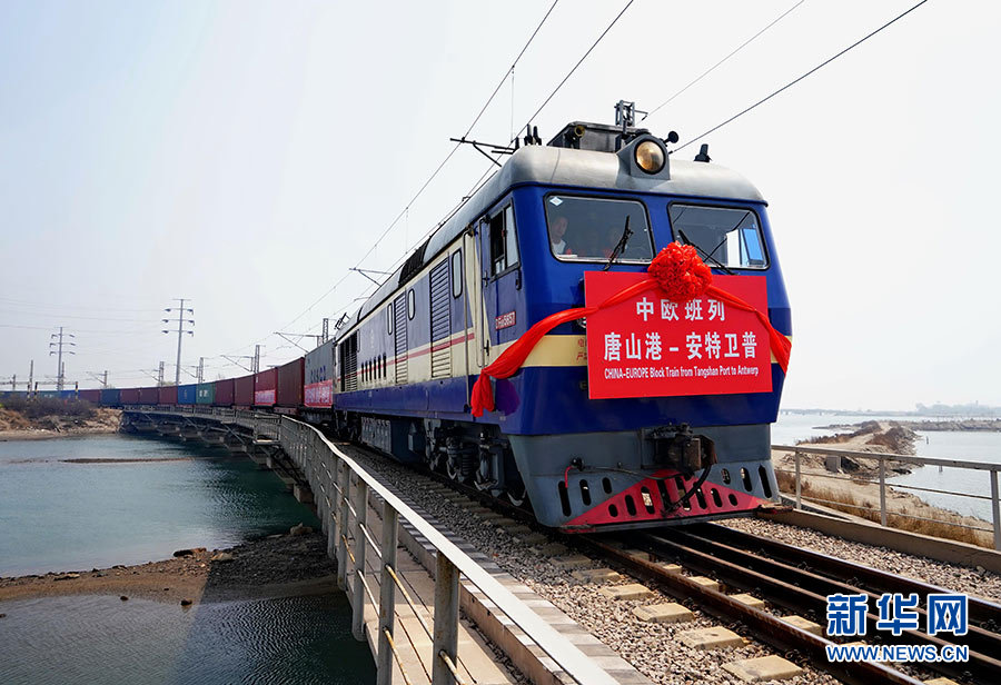 發往比利時安特衛普的國際集裝箱班列從河北唐山港京唐港區駛出(4月26日攝)。唐山港京唐港區當日正式開通中歐國際集裝箱班列。新華社記者 楊世堯 攝