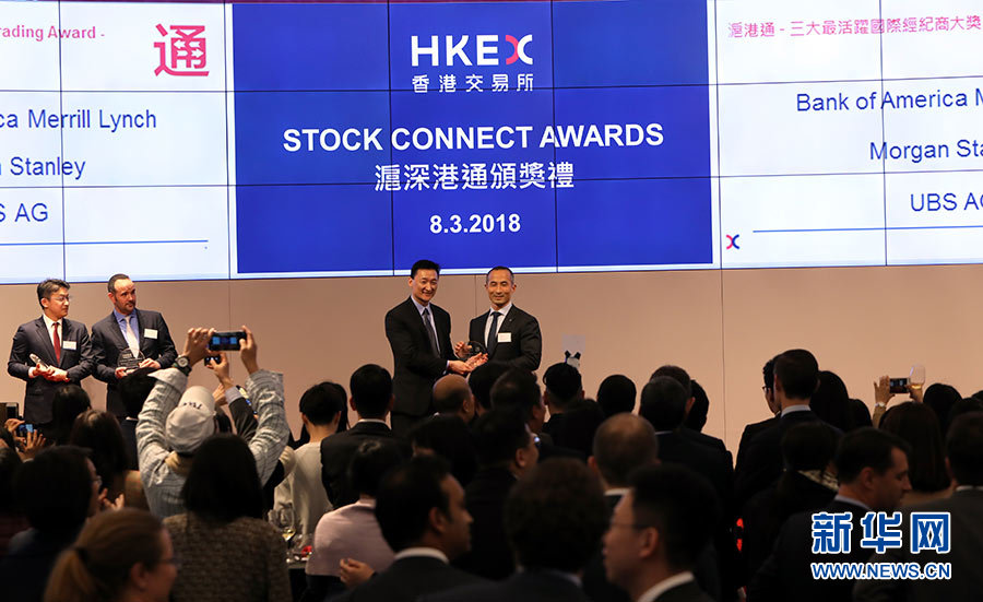 香港交易所舉辦2017年度“滬深港通”頒獎禮,表揚主要經紀商于2017年參與“滬深港通”互聯互通股票交易機制所取得的成績(3月8日攝)。新華社記者 李鵬 攝