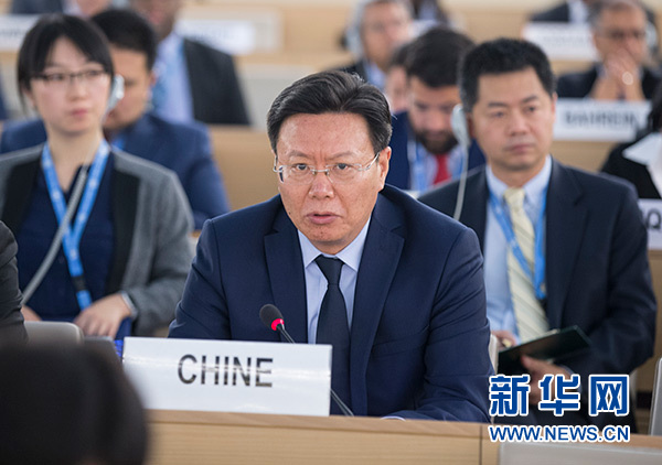 5月18日,在瑞士日內瓦萬國宮,中國常駐聯合國日內瓦辦事處和瑞士其他國際組織代表俞建華(中)出席聯合國人權理事會加沙局勢特別會議。新華社記者 徐金泉 攝