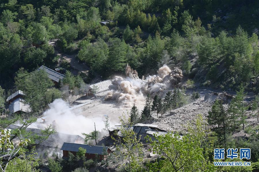 這是5月24日在朝鮮咸鏡北道吉州郡的豐溪里核試驗場拍攝的場內地面建筑爆破場景。 新華社記者程大雨 攝