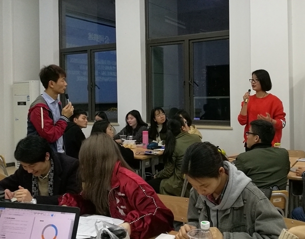 圖為2018年3月,李儒欽(左站立者)在福州和兩岸青年做青年創業分享課。