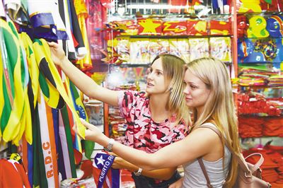 2018俄羅斯“世界杯”帶火浙江義烏體育用品。圖為6月13日,兩名俄羅斯客商在義烏國際商貿城采購球迷用品。人民視覺