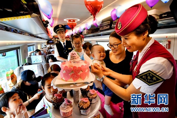 6月26日,在北京南至上海虹橋的G1次“復興號”列車上,乘務員與旅客一起切蛋糕慶祝。當日,由北京南至上海虹橋的G1次“復興號”列車上舉行“復興號”運營一周年慶祝活動。“復興號”是由中國鐵路總公司牽頭組織研制、具有完全自主知識產權、達到世界先進水平的中國標準動車組,自2017年6月26日投入運營以來,以其良好的乘車體驗廣受旅客歡迎。新華社發(楊寶森 攝)