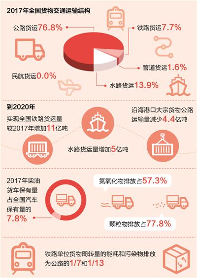 優化調整交通運輸結構方面,在7月2日舉行的國務院政策例行吹風會上,交通運輸部有關負責人介紹,以推進大宗貨物運輸“公轉鐵、公轉水”為主攻方向,通過三年集中攻堅,到2020年實現全國鐵路貨運量較2017年增加11億噸、增長30%,水路貨運量增加5億噸、增長7.5%,沿海港口大宗貨物公路運輸量減少4.4億噸。今年起,在全國范圍實施鐵路運能提升、水運系統升級、公路貨運治理、多式聯運提速、信息資源整合、城市綠色配送等六大行動。