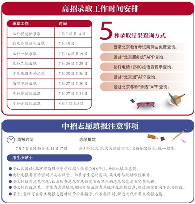據北京教育考試院介紹,高招錄取工作于7月7日至8月3日進行。今年高校在京招生實行計算機遠程網上錄取,順序志愿第一志愿錄取結束后,若高校招生計劃未完成,將對未完成計劃進行第二志愿投檔錄取。