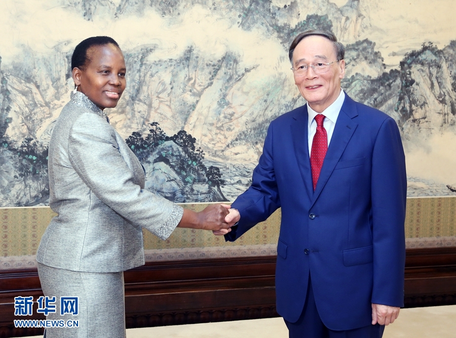 ?7月13日,國家副主席王岐山在北京中南海會見博茨瓦納國際事務與合作部長尤妮蒂·道。 新華社記者 姚大偉 攝