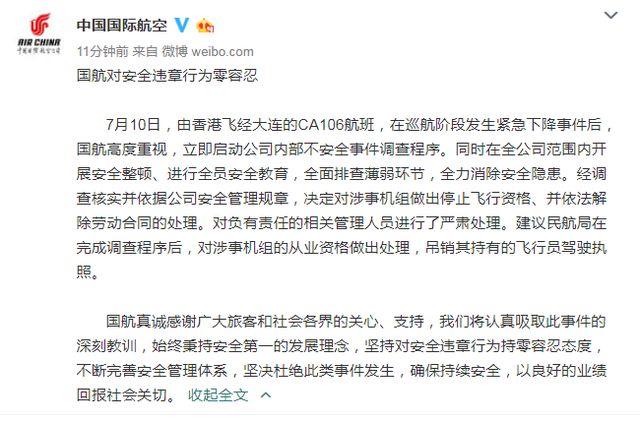 國航方面11日通過其官方微博回應稱,目前機組正在接受中國民用航空局相關部門的調查,如果調查發現機組存在違章違規行為,公司將以零容忍的態度對責任人嚴肅處理。2018-07-11 22:19:03