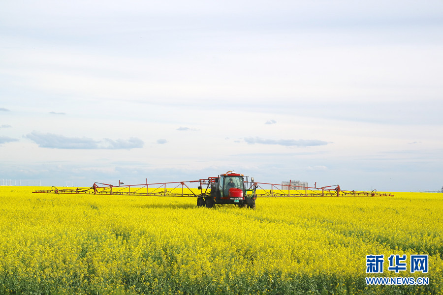 7月21日,一輛自走式噴藥機正在內蒙古呼倫貝爾市謝爾塔拉農場對油菜花進行追肥作業。(新華網 汪亞/攝)