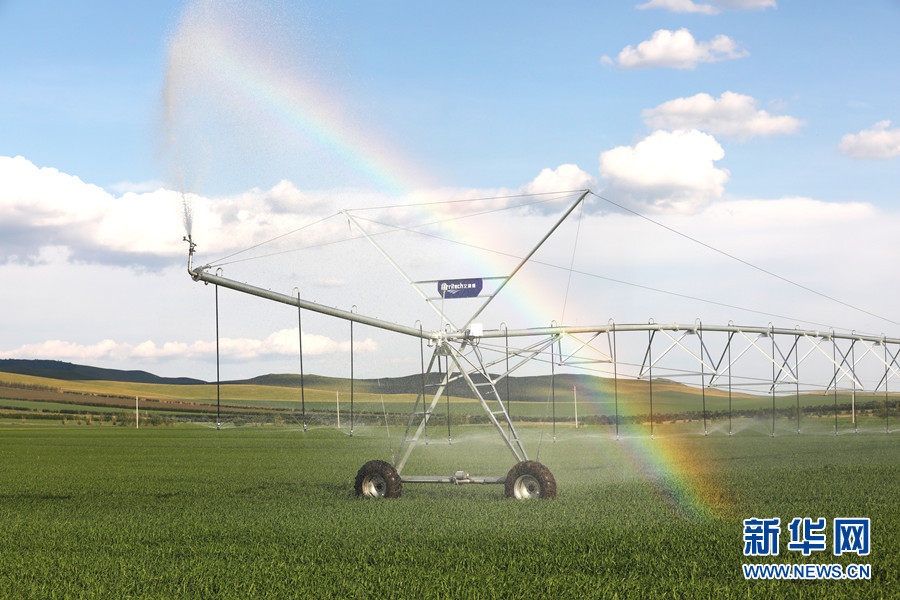 6月23日,在內蒙古呼倫貝爾墾區蘇沁農牧場的小麥地里,一輛平移式噴灌機正在田里進行噴灌作業。(內蒙古呼倫貝爾農墾供圖)