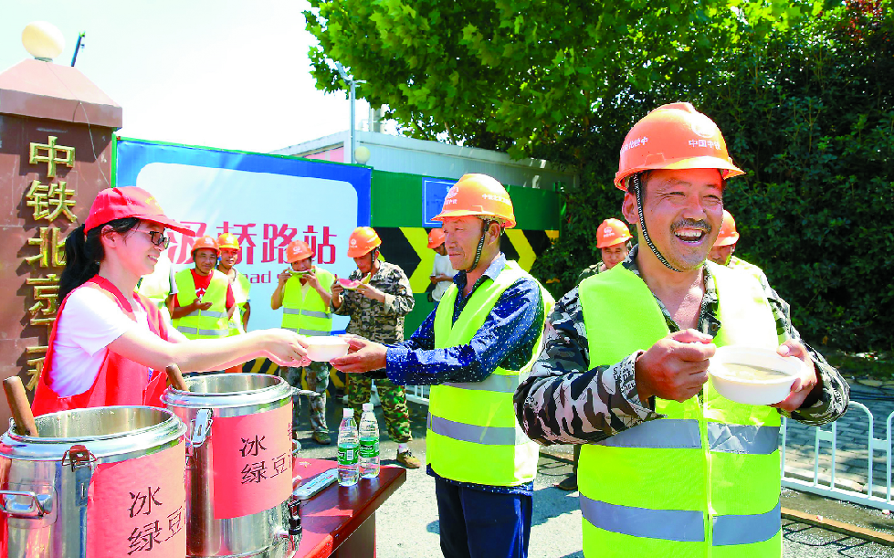 7月7日,文安縣城管局工作人員為環衛工人灌裝綠豆湯。新華社記者李曉果攝