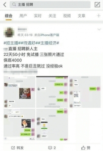 各大(da)直播平臺上(shang)土豪(hao)也非常多,動不動就幾萬幾十萬地打(da)賞。這(zhe)些給了愛美且(qie)渴望(wang)鮮花(hua)和掌聲的(de)女孩(hai)子一(yi)夜爆紅的(de)不切實際的(de)幻想。打(da)開任意一(yi)個(ge)社交軟件,搜索(suo)“主播招聘”會立(li)刻彈出上(shang)萬條信息,其中不乏“月入上(shang)萬不是夢”“管吃管住,不是巨丑就過”這(zhe)樣極具(ju)吸引力的(de)條件。