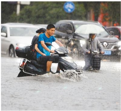 8月4日,江西省九江市出現強降雨,市民騎車涉水前行。人民視覺
