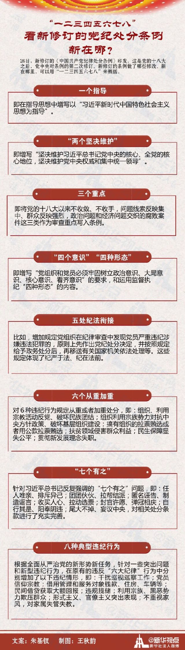 新版黨紀(ji)(ji)處分(fen)條(tiao)例(li)將于2018年10月1日(ri)起施(shi)行。它的頒(ban)布施(shi)行必將不斷提高(gao)紀(ji)(ji)律建設的政治性、時代(dai)性、針對(dui)性,以更(geng)加(jia)(jia)科(ke)學、更(geng)加(jia)(jia)嚴密、更(geng)加(jia)(jia)有效的思(si)路舉措,推(tui)動全(quan)面(mian)從(cong)嚴治黨取得更(geng)大戰略性成果。