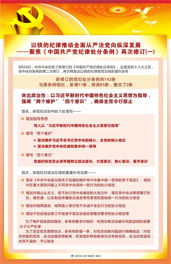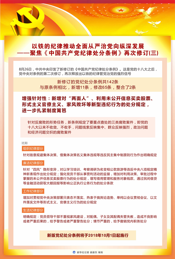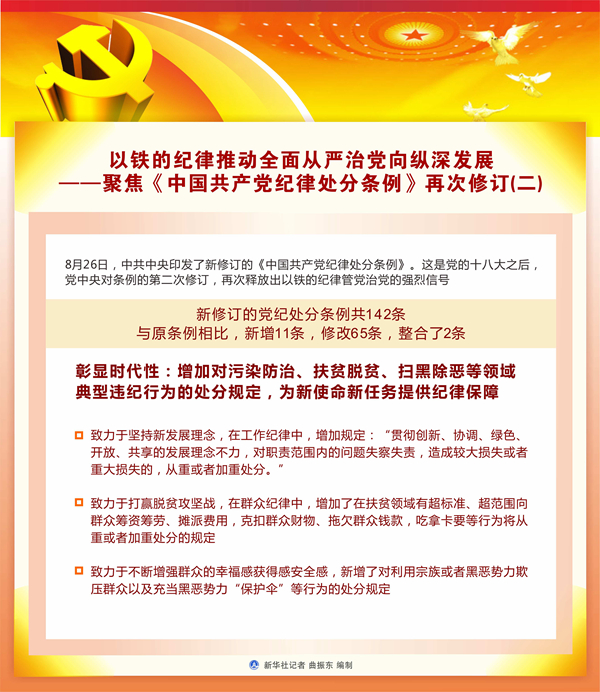 新華社北京(jing)8月(yue)27日電(dian) 題:以鐵的紀(ji)律推動全面從嚴治黨向(xiang)縱(zong)深發展——聚(ju)焦《中國共產黨紀(ji)律處分條例》再次修(xiu)訂