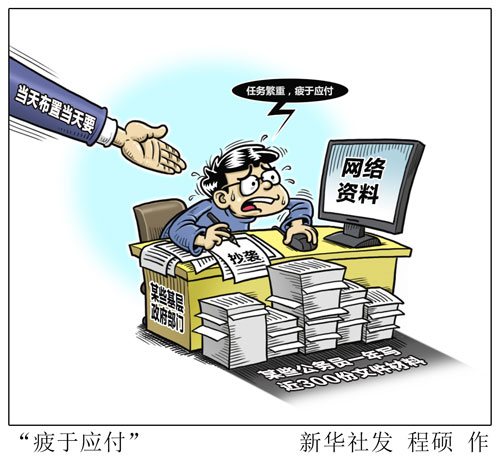 湖北省某縣委(wei)政(zheng)研室(shi)干部(bu)說,一些(xie)黨員干部(bu)特(te)別是領導干部(bu)能力不(bu)濟,把發(fa)文(wen)、開會(hui)當作抓落(luo)實(shi)的(de)(de)主要方式(shi)方法(fa),甚至(zhi)將(jiang)其做成履(lv)職盡(jin)責(ze)、推卸責(ze)任的(de)(de)“痕跡”,一些(xie)文(wen)件(jian)層(ceng)層(ceng)轉發(fa)、照(zhao)抄照(zhao)轉,很(hen)多時(shi)候(hou)并無(wu)新的(de)(de)實(shi)質(zhi)性(xing)內容(rong),完全(quan)是重復(fu)上級精神,造(zao)成基層(ceng)干部(bu)有(you)看不(bu)完的(de)(de)文(wen)件(jian)、開不(bu)完的(de)(de)會(hui)。