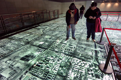 兩位北京市民在北京市規劃展覽館的城市模型上尋找自己家的位置 王建華 攝