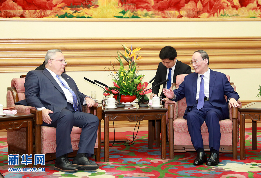 8月28日,國家副主席王岐山在北京中南海會見希臘外長科恰斯。 新華社記者丁海濤攝