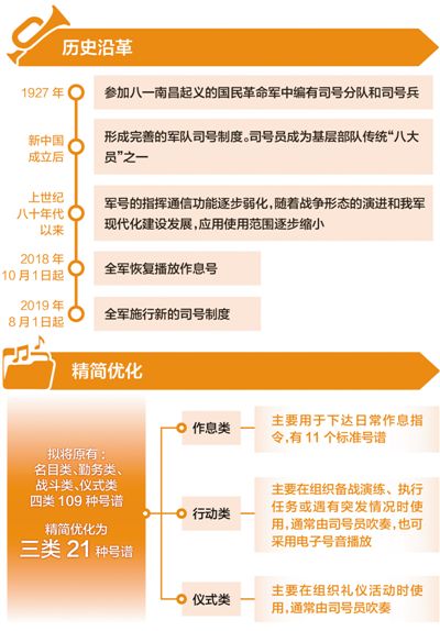 中央軍(jun)委訓練管理部9月(yue)(yue)11日(ri)發布消息(xi)稱(cheng),我(wo)軍(jun)司號(hao)(hao)制度恢復(fu)和(he)完善工作全面展開,計劃(hua)分(fen)兩步組織實(shi)施:2018年(nian)10月(yue)(yue)1日(ri)起,按現行(xing)規(gui)定全軍(jun)恢復(fu)播放作息(xi)號(hao)(hao);2019年(nian)8月(yue)(yue)1日(ri)起,全軍(jun)施行(xing)新(xin)的司號(hao)(hao)制度。
