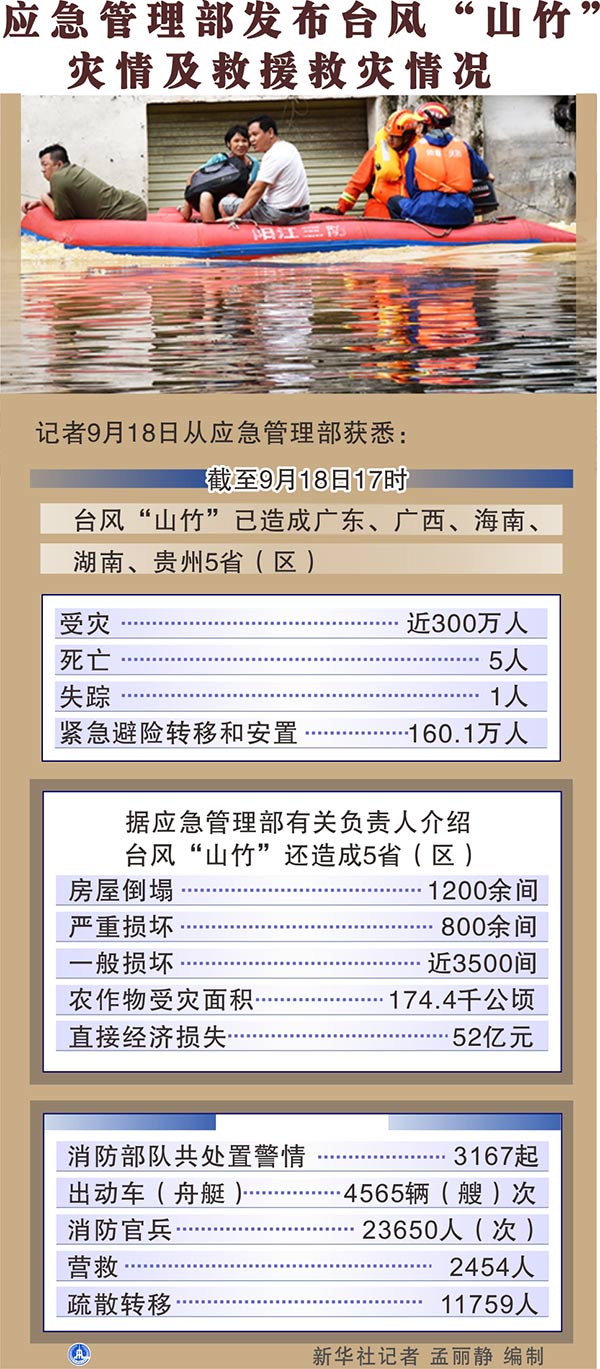 新華社北京9月(yue)18日電(記者葉昊鳴(ming))記者18日從(cong)應急(ji)管理部獲悉,截至18日17時,臺風“山(shan)竹”已造成(cheng)廣東、廣西、海南、湖南、貴州5省(區)近300萬(wan)人(ren)受災(zai),5人(ren)死(si)亡,1人(ren)失蹤,160.1萬(wan)人(ren)緊急(ji)避險轉移和安置(zhi)。