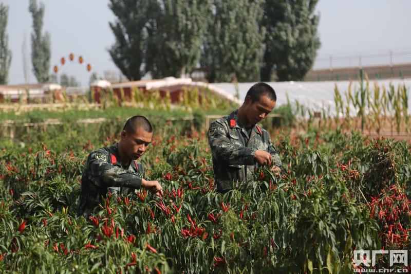 官兵在摘辣椒(央廣網記者 李建峰 攝)