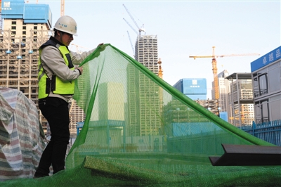今年2月,中國鐵物大廈項目工地配備網眼更細密的防塵網,有助更好控制揚塵污染。 資料圖片/新京報記者 吳江 攝