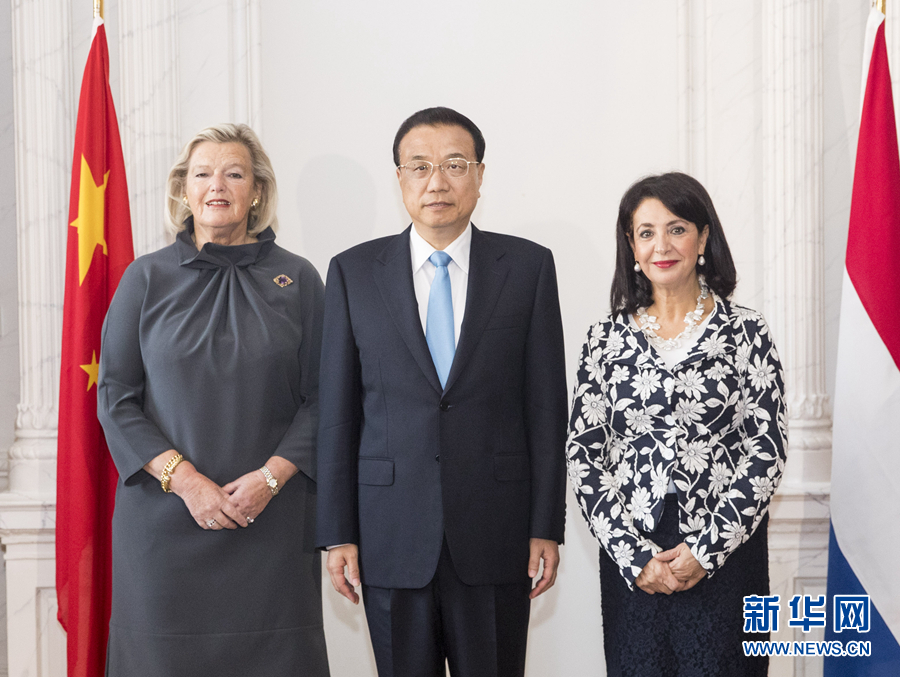當地時間10月16日上午,國務院總理李克強在荷蘭議會大廈會見荷蘭議會兩院議長安吉·布魯克斯-克諾爾(左)和哈蒂亞·阿瑞布(右)。 新華社記者 王曄 攝