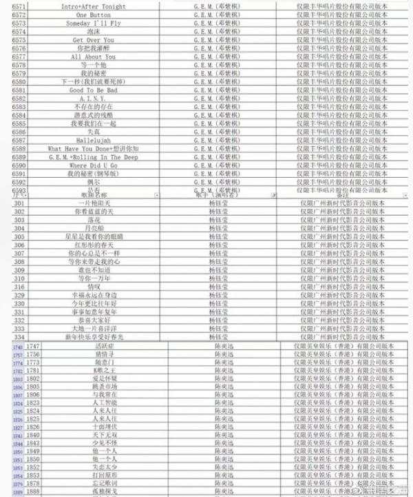附(fu)件中(zhong)共列出6609部要求(qiu)下(xia)架的(de)音樂電視作品。記者發現,陳奕迅的(de)《十年(nian)》《圣誕結(jie)》、信樂團的(de)《死了都要愛》等大家耳(er)熟(shu)能詳、幾乎是KTV必點曲(qu)目,也(ye)都在“下(xia)架”之(zhi)列。
