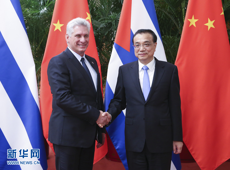 11月8日,國務院總理李克強在北京人民大會堂會見來華進行國事訪問的古巴國務委員會主席兼部長會議主席迪亞斯-卡內爾。 新華社記者姚大偉攝