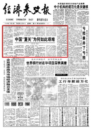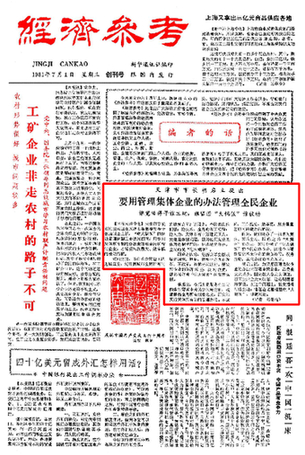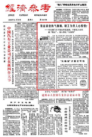 這是《經濟(ji)參考報》的(de)創刊(kan)號。在(zai)(zai)頭版《要用管理集(ji)體(ti)企(qi)(qi)業的(de)辦(ban)(ban)法(fa)管理全民(min)(min)企(qi)(qi)業》一文(wen)中,時任天津市市長胡(hu)啟立(li)表示,“吃(chi)大鍋飯”的(de)經濟(ji)管理體(ti)制(zhi)已走(zou)進死胡(hu)同。如果用管理集(ji)體(ti)企(qi)(qi)業的(de)辦(ban)(ban)法(fa)來管理全民(min)(min)企(qi)(qi)業,浪費會大大減少,國家收入會大大增加(jia),職工(gong)生活會大大改善,這是明擺著的(de)事情(qing)。在(zai)(zai)這個問題上,誰(shui)覺悟(wu)得早誰(shui)主動;誰(shui)還在(zai)(zai)老框(kuang)框(kuang)里(li)吃(chi)“大鍋飯”,誰(shui)就被(bei)動。